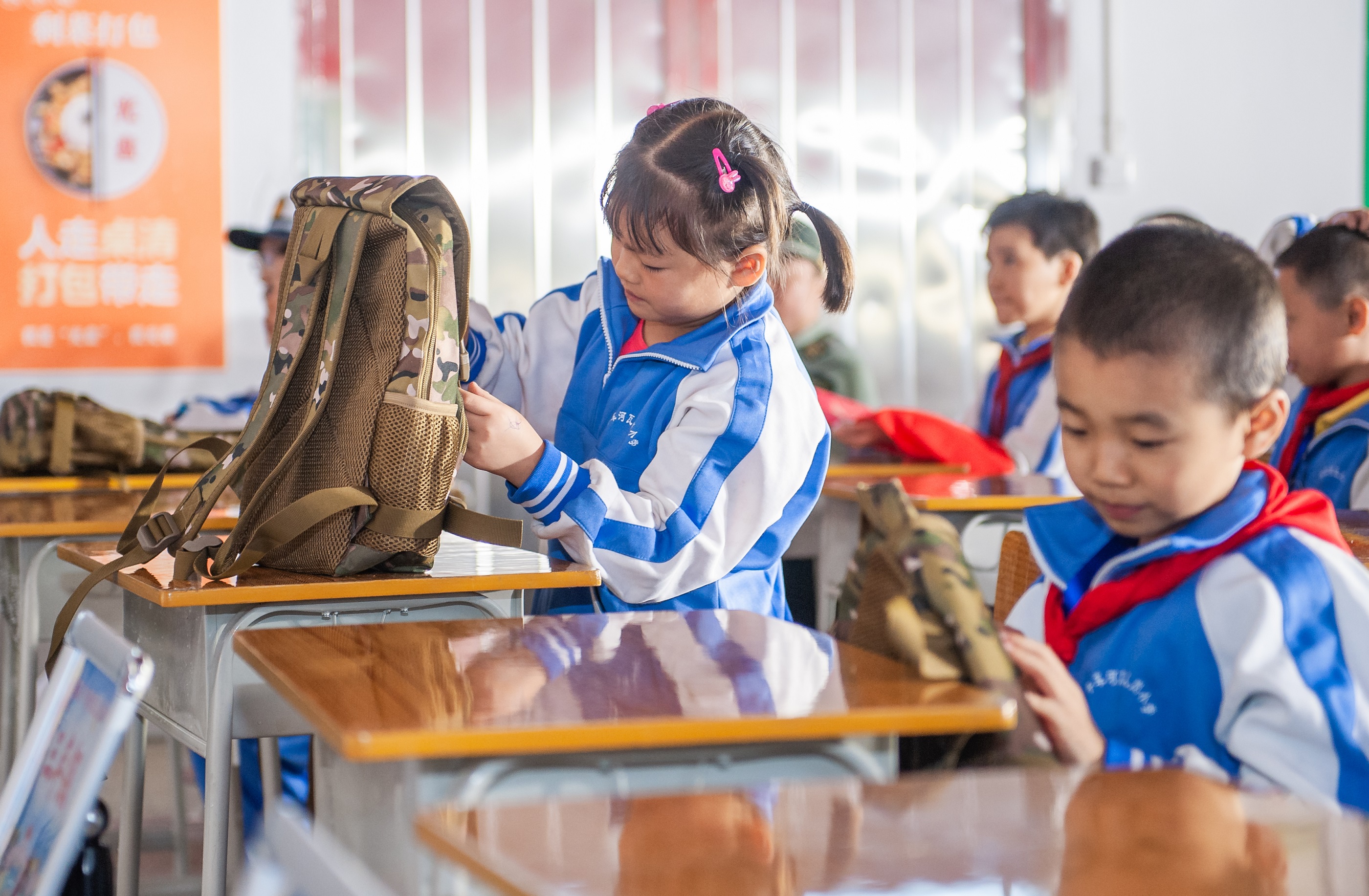 圖為瓦兒崗小學(xué)學(xué)生開(kāi)心地打開(kāi)迷彩小書(shū)包。彭三珊 攝