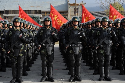 圖為2014年機動一中隊組織開展防暴處突訓(xùn)練。