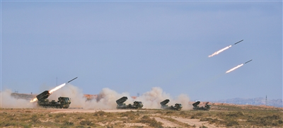 炮火封鎖、空中偵察……“敵”情接踵而至,紅方裝甲兵、炮兵、工兵等多兵種密切協(xié)同,迅速占領(lǐng)有利打擊陣位?!叭B射擊,101號(hào)目標(biāo)火力點(diǎn)……”紅方指揮員一聲令下,某自行火箭炮炮手快速校對(duì)標(biāo)尺、高低和方向,精準(zhǔn)鎖定“敵”目標(biāo)。炮聲響起,一枚枚火箭彈射向目標(biāo),一時(shí)間,戈壁深處烽煙四起。