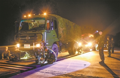測(cè)量邊距、打入鐵釘、捆綁加固……鐵路裝載現(xiàn)場(chǎng),官兵僅憑汽車近光燈和手電照明,熟練地進(jìn)行分組作業(yè)。除了器械碰撞聲,很少聽到其他聲音,全程一氣呵成、干凈利落。