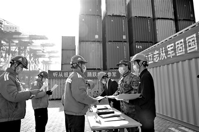 1月30日,山東省港口集團在某碼頭作業(yè)現(xiàn)場設(shè)立征兵咨詢站,為大學生員工解答征兵政策。黃向東 攝