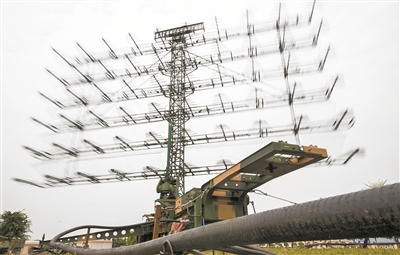 操作方艙內(nèi),各號(hào)手屏氣凝神?!胺轿弧痢?,距離××,發(fā)現(xiàn)目標(biāo)!”參謀人員迅速報(bào)告“敵情”。話音未落,“敵”機(jī)對(duì)地面雷達(dá)釋放強(qiáng)電磁干擾,并伺機(jī)向陣地逼近。