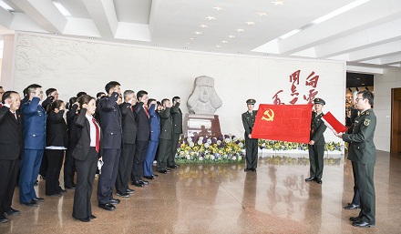 在雷鋒紀(jì)念館前,沈陽軍事法院院長陶韜、遼寧省高級人民法院副院長任延忠等50余名軍地法官面向黨旗莊嚴(yán)宣誓,重溫入黨誓詞。