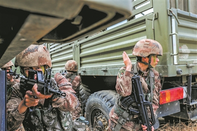 “全班注意!前方發(fā)現(xiàn)‘?dāng)场椤毖信心繕?biāo)區(qū)域態(tài)勢后,班長馮坤娜下達(dá)作戰(zhàn)命令。隨即,狙擊手快速占領(lǐng)高地,對“敵”進(jìn)行警戒;無人機(jī)操作手放飛無人機(jī)實(shí)施偵察,將相關(guān)信息實(shí)時上報(bào)指揮中心;突擊組向“敵”警戒區(qū)域隱蔽滲透……