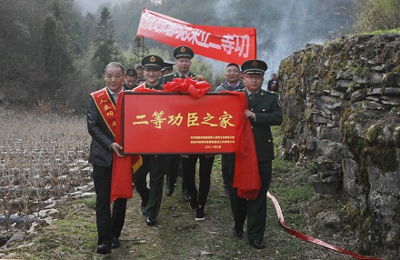 圖為軍地領(lǐng)導(dǎo)將立功喜報(bào)及牌匾送往立功官兵家中。彭磊 攝