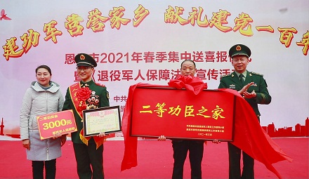 近日,武警湖北省總隊(duì)荊門支隊(duì)聯(lián)合地方政府開(kāi)展“送喜報(bào)到家鄉(xiāng)”活動(dòng),將“二等功臣之家”牌匾及立功喜報(bào)送到荊門支隊(duì)機(jī)動(dòng)二中隊(duì)班長(zhǎng)張瑜家中,表達(dá)對(duì)立功官兵及家屬的關(guān)懷和問(wèn)候。不少鄰里鄉(xiāng)親也趕到現(xiàn)場(chǎng),敲鑼打鼓、載舞歡歌,一起見(jiàn)證這份榮譽(yù),并送上誠(chéng)摯的祝福。