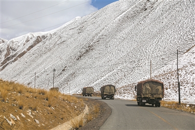 車(chē)隊(duì)穿行在雪山達(dá)坂間。