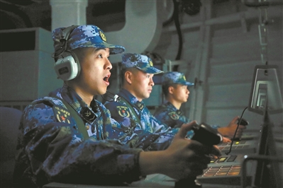 夜幕降臨,編隊(duì)轉(zhuǎn)入反潛訓(xùn)練。“方位××,距離××,發(fā)現(xiàn)金屬回音!”經(jīng)過仔細(xì)搜索,某艦發(fā)現(xiàn)“敵”潛艇,迅速通報(bào)編隊(duì)其他艦艇并對(duì)其實(shí)施打擊。
