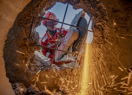圖為官兵利用內(nèi)燃無齒鋸進(jìn)行快速破拆。
