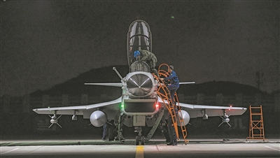 深夜,華東某機場萬籟俱寂。突然,一發(fā)綠色信號彈點亮夜空。伴著巨大的轟鳴聲,東部戰(zhàn)區(qū)海軍航空兵某旅數(shù)架戰(zhàn)機接續(xù)升空,投入高強度夜間飛行訓(xùn)練。