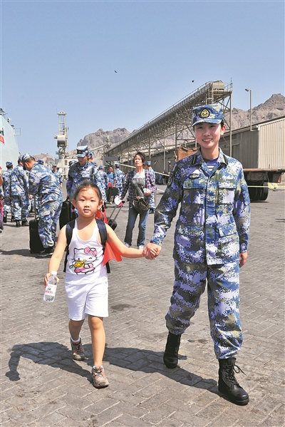 2015年也門(mén)撤僑行動(dòng)中,郭燕手牽一個(gè)小朋友上艦回家。熊利兵 攝