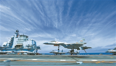 2018年4月12日,遼寧艦航母編隊(duì)參加南海大閱兵之后,隨即奔赴遠(yuǎn)海,開(kāi)展實(shí)兵對(duì)抗演練。圖為演練中殲-15艦載戰(zhàn)斗機(jī)放下尾鉤準(zhǔn)備著艦。本報(bào)記者 張雷 攝