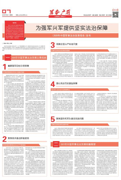 2020年,中國軍事法治發(fā)展亮點眾多、成就顯著,同時也要看到,軍事法治建設依然任重道遠。站在新起點新征程,中國軍事法治建設緊緊圍繞我軍建設“十四五”規(guī)劃布局謀劃和推進各項工作,圍繞推進習近平法治思想宣傳貫徹、加快推進重點領域軍事政策制度改革、加強練兵備戰(zhàn)法治保障、提高軍隊政法工作服務備戰(zhàn)打仗質量效能、強化維護官兵權益法治保障等將取得新的成效、實現(xiàn)新的躍升。