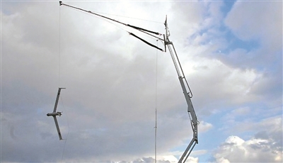 “天鉤”回收。這種方式同樣是用于中小型固定翼無人機的降落。這種降落方式可視為對撞網(wǎng)回收方式的高度簡化,即將攔阻網(wǎng)簡化為一根繩索,將數(shù)個支架簡化為一根高強度的支柱。