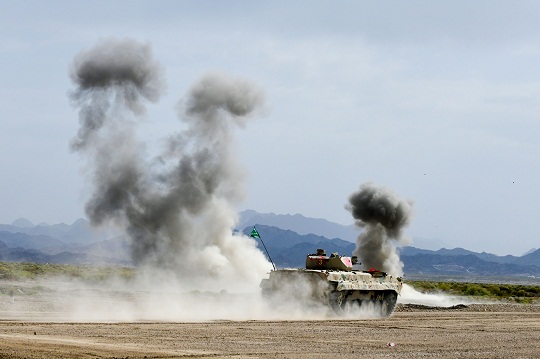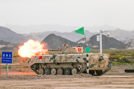 圖為中國(guó)參賽隊(duì)陸軍代表隊(duì)對(duì)步戰(zhàn)車目標(biāo)進(jìn)行實(shí)彈射擊。王俊 攝