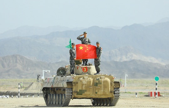 圖為中國(guó)參賽隊(duì)陸軍代表隊(duì)在賽道上疾馳。王俊 攝