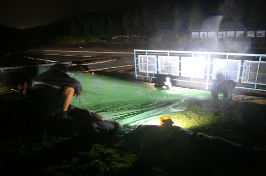 處于海南島最東端的銅鼓嶺測(cè)控點(diǎn),三面環(huán)山、風(fēng)大浪高,地勢(shì)的原因讓這里的防臺(tái)形勢(shì)更加嚴(yán)峻。曾經(jīng),2014年臺(tái)風(fēng)“威馬遜”登陸時(shí),中心風(fēng)力達(dá)17級(jí)。為拯救光學(xué)實(shí)況記錄設(shè)備,測(cè)控點(diǎn)成立突擊小分隊(duì),在狂風(fēng)暴雨中用繩索相互捆綁,成功保住了測(cè)控設(shè)備。這次臺(tái)風(fēng)過境,點(diǎn)號(hào)航天工作者更是未雨綢繆,提前開展臺(tái)風(fēng)形勢(shì)研判,實(shí)地查看風(fēng)險(xiǎn)隱患和防范重點(diǎn)難點(diǎn),緊前加固設(shè)備天線罩,加蓋防雨布層層保護(hù)核心部位,力爭(zhēng)設(shè)備設(shè)施零損失。12日晚,連夜的暴雨導(dǎo)致測(cè)控點(diǎn)綠化斜坡松動(dòng),應(yīng)急分隊(duì)聞令而動(dòng),冒著大雨全力疏通泄洪渠道,壓緊壓實(shí)斜坡,及時(shí)避免了可能帶來的斜坡塌方和建筑損傷。