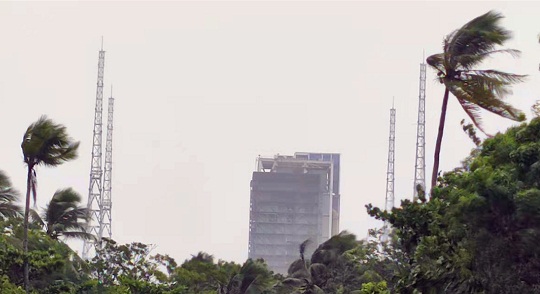圖為將回轉(zhuǎn)平臺(tái)全部打開迎戰(zhàn)臺(tái)風(fēng)的發(fā)射塔架。郭強(qiáng)強(qiáng) 董海龍 攝