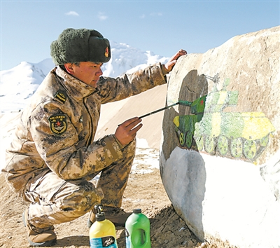 紅船起航、戰(zhàn)車轟鳴、雪地巡邏……在形狀各異的喀喇昆侖高原石上,帕肉克和戰(zhàn)友們精心繪制了展現(xiàn)光榮黨史和高原駐訓(xùn)生活的畫作,讓冷冰冰的石頭變得生動鮮活起來。官兵都說,“石頭畫”創(chuàng)作,不僅豐富了駐訓(xùn)生活,更為他們留下了難忘的記憶。
