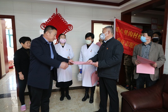 圖為后八里溝村黨委書記宋偉(右二)帶領(lǐng)黨員志愿服務(wù)隊(duì)入戶排查。