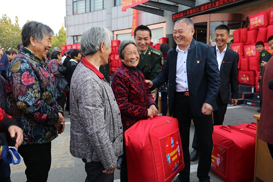 圖為宋偉(右二)為轄區(qū)老年人發(fā)放重陽(yáng)節(jié)節(jié)日福利。