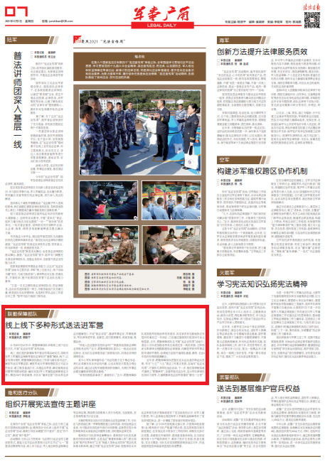 近年來,聯(lián)勤保障部隊(duì)把強(qiáng)化官兵法治意識(shí)和法治思維,作為“七五”“八五”普法工作重點(diǎn)來抓。在每年“憲法宣傳周”,開展形式多樣的送法活動(dòng)。下一步,他們將積極探索開通網(wǎng)上“聯(lián)勤律所”、加強(qiáng)軍地司法合作、加大軍隊(duì)律師隊(duì)伍培訓(xùn)力度等,打通聯(lián)勤特色法治軍營建設(shè)“最后一公里”。