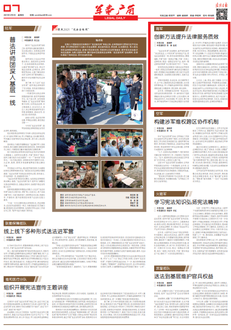 堅(jiān)持把改進(jìn)法律服務(wù)與建設(shè)法治軍營(yíng)統(tǒng)一起來,把普法宣傳教育與解決涉法問題結(jié)合起來,把挖掘自身法援潛能與借力地方司法資源統(tǒng)籌起來,全流程優(yōu)化服務(wù)模式、創(chuàng)新方法手段。