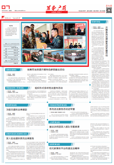 在今年的“憲法宣傳周”活動(dòng)期間,全軍部隊(duì)開(kāi)展了形式多樣的宣傳活動(dòng),通過(guò)送法進(jìn)軍營(yíng)、組建普法宣講團(tuán)、提供法律援助等形式,在軍營(yíng)掀起崇尚法治、推進(jìn)法治建設(shè)的熱潮。