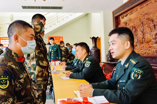 圖② 青海軍地法官向官兵代表贈(zèng)送法律書籍。羅元?jiǎng)P 攝