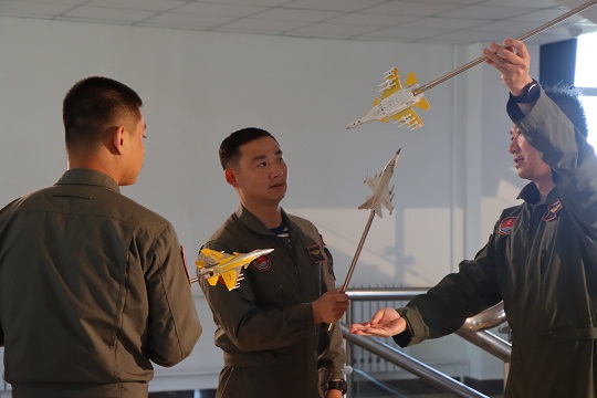 圖為海軍航空大學(xué)某基地組織地面演練,這是飛行教官丁陽(yáng)(右一)正用飛機(jī)模型教授學(xué)員戰(zhàn)術(shù)動(dòng)作。趙天淏 攝