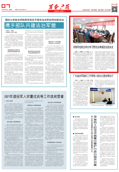 鄭州軍事法院領(lǐng)導(dǎo)在座談會(huì)上講到,2015年,河南省人民政府、河南省軍區(qū)聯(lián)合印發(fā)《關(guān)于進(jìn)一步加強(qiáng)軍人軍屬法律援助工作的通知》,實(shí)現(xiàn)軍人軍屬法律援助工作全覆蓋,對(duì)河南籍軍人軍屬申請(qǐng)法律援助免予經(jīng)濟(jì)困難條件審查,不設(shè)法律援助事項(xiàng)范圍限制;為非河南籍官兵做好法律咨詢、訴訟代理、申請(qǐng)引導(dǎo)、異地協(xié)作等工作,滿足官兵多層次法律援助需求。河南省已連續(xù)11年開(kāi)展法律援助進(jìn)軍營(yíng)活動(dòng),舉辦6屆河南省軍人軍屬法律援助精品案件評(píng)選。2021年11月30日,承辦全國(guó)“憲法進(jìn)軍營(yíng)”線上啟動(dòng)儀式,在儀式上,河南省司法廳、河南省軍區(qū)政治工作局、鄭州軍事法院共同簽署《關(guān)于建立新時(shí)代河南省軍人軍屬公共法律服務(wù)工作協(xié)作機(jī)制的協(xié)議》,并掛牌成立河南省軍人軍屬法律援助工作站,進(jìn)一步加強(qiáng)軍地協(xié)作。