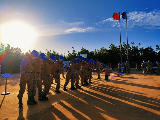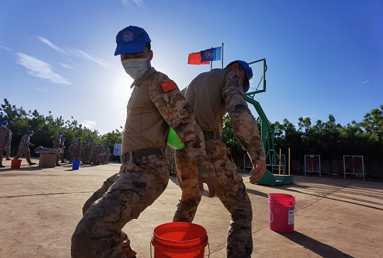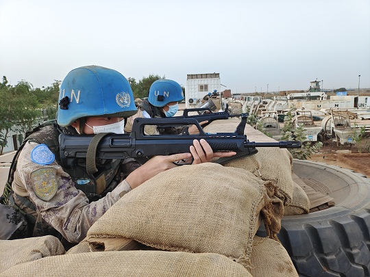 春節(jié)期間,中國第九批赴馬里維和工兵分隊組織了戰(zhàn)備演練。圖為營區(qū)警報響后,快反組迅速領(lǐng)取武器彈藥,占領(lǐng)預(yù)定位置,進入嚴(yán)密戒備狀態(tài)。王宏陽 攝