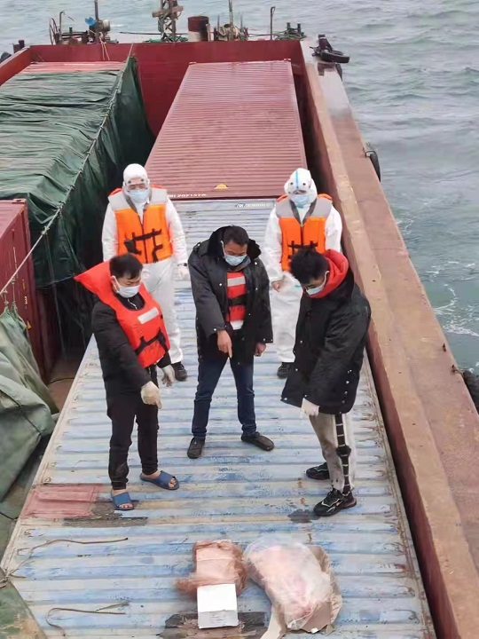 該局繼續(xù)加大“兩反”執(zhí)勤執(zhí)法力度,連續(xù)作戰(zhàn),于次日凌晨1時許根據(jù)線報指引,派遣執(zhí)法艇前往外伶仃島附近海域開展查緝行動。到達目標海域后,海警執(zhí)法員快速鎖定了一艘無舷號可疑船舶,當即拉響警報令其停船并接受檢查,但嫌疑船只拒不停船,并加速逃竄。該局隨即采取指揮艇與摩托艇夾擊態(tài)勢高速追擊,經(jīng)過幾輪周旋,最終成功逼停該可疑船只。經(jīng)登臨檢查發(fā)現(xiàn),該船有船員3人,載有無合法手續(xù)冷凍豬肚一批,船上人員均無法提供任何有效船舶證件、貨物合法來源證明及檢驗檢疫證明等相關(guān)資料,涉嫌走私。海警執(zhí)法員隨即將涉案船舶及所載凍品查扣,抓獲涉案人員3人。