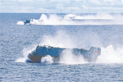 海上威脅剛解除,新的“敵”情傳來。接到命令,數(shù)艘氣墊艇搭載登陸兵力駛離母艦,在海上組成登陸編隊,朝目標高速奔襲……