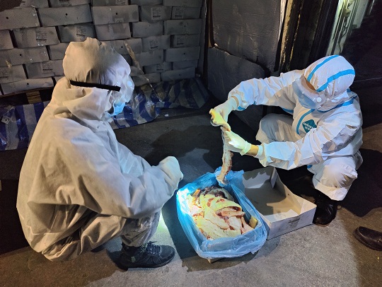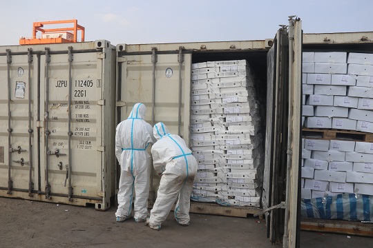 3月13日17時(shí)許,江門海警局根據(jù)情報(bào)獲悉,在江門市黃茅海對(duì)開(kāi)海域有走私活動(dòng)。該局立即派遣2艘執(zhí)法艇前往目標(biāo)海域進(jìn)行查緝。當(dāng)日18時(shí)許,該局執(zhí)法員通過(guò)AIS在目標(biāo)海域發(fā)現(xiàn)一艘可疑船只,遂即拉響警報(bào),表明身份,責(zé)令可疑船只立即停船接受檢查。在可疑船只停船后,經(jīng)執(zhí)法員登臨檢查發(fā)現(xiàn),該船舶上裝載有29個(gè)長(zhǎng)20英尺的集裝箱,集裝箱中載有大量?jī)銎?,凍品外包裝上均有明顯的外文標(biāo)識(shí),由于天氣炎熱且船上沒(méi)有任何冷鏈保存裝置,部分凍品已出現(xiàn)腐敗發(fā)臭跡象,隨船未發(fā)現(xiàn)該批凍品任何合法來(lái)源和檢驗(yàn)檢疫證明,執(zhí)法員隨即將涉案船舶及所載凍品依法進(jìn)行查扣。
