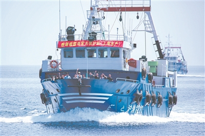 圖為被護漁船船員懸掛橫幅并揮手致意,向護航編隊表示感謝。胡韋楠 攝