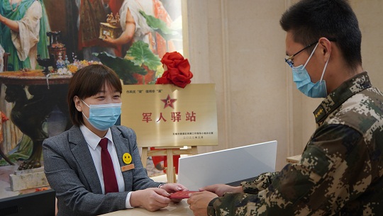 “來(lái)到‘軍人驛站’,看到房間內(nèi)干凈整潔的床上用品,一應(yīng)俱全的配套設(shè)施,充滿(mǎn)濃厚軍旅元素的物品飾件,還有熱情周到的服務(wù),我感覺(jué)就像住進(jìn)家里一樣溫馨?!苯眨渚瘷C(jī)動(dòng)某支隊(duì)現(xiàn)役警官蔣晨入住江蘇省無(wú)錫市某酒店“軍人驛站”后,談及他的感受。