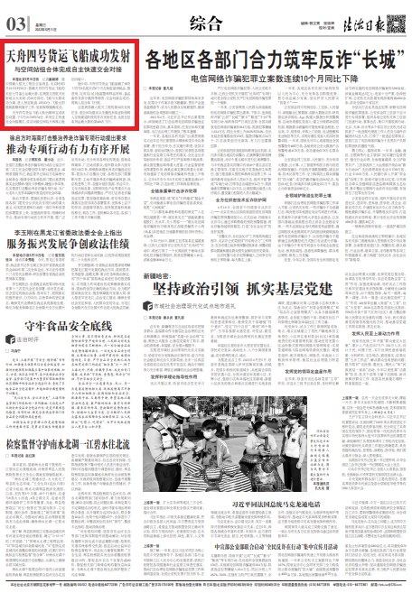 本報(bào)北京5月10日訊 記者廉穎婷 據(jù)中國(guó)載人航天工程辦公室消息,北京時(shí)間5月10日1時(shí)56分,搭載天舟四號(hào)貨運(yùn)飛船的長(zhǎng)征七號(hào)遙五運(yùn)載火箭,在我國(guó)文昌航天發(fā)射場(chǎng)點(diǎn)火發(fā)射。約10分鐘后,飛船與火箭成功分離,進(jìn)入預(yù)定軌道,2時(shí)23分,飛船太陽(yáng)能帆板順利展開(kāi)工作,發(fā)射取得圓滿成功。