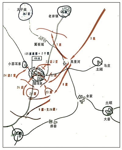 晉冀魯豫野戰(zhàn)軍第3縱隊(duì)接到戰(zhàn)斗命令后,要求各部隊(duì)迅速行動(dòng),直插邵耳寨附近的指定位置,向敵第125旅發(fā)起進(jìn)攻。具體部署為:第8旅(配屬第9旅第26團(tuán))擔(dān)負(fù)攻打邵耳寨的任務(wù);第7旅在黃村寨、謝家城一線占領(lǐng)陣地,阻擊南援之?dāng)常?dān)任預(yù)備隊(duì);第9旅(欠第26團(tuán))在張王寨集、大沙邱一線占領(lǐng)陣地,阻擊北援之?dāng)臣胺罃惩粐?/p>