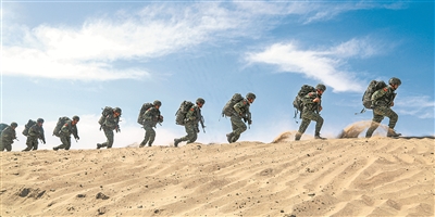圖為該中隊官兵在沙漠腹地開展奔襲訓(xùn)練。王國銀 攝