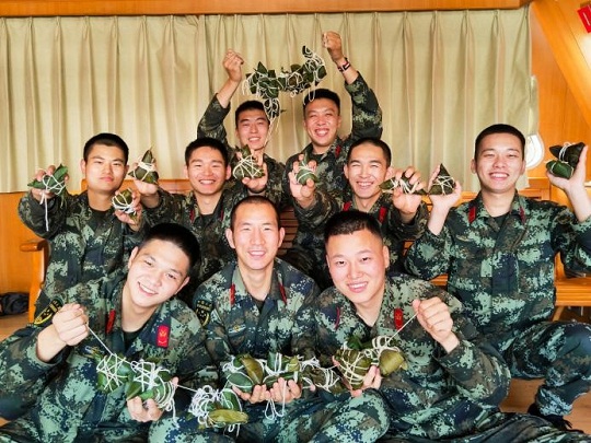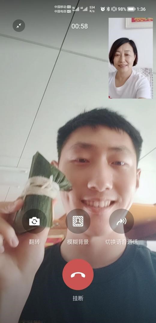 和媽媽撥通了視頻的執(zhí)法員小王高興地炫耀著手里的粽子:“媽媽,端午安康,不用擔心我,我在這邊一切都好,你看這是我自己包的粽子?!?/p>