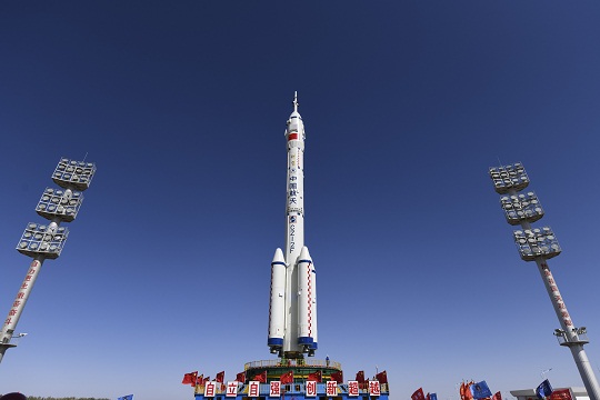 白色的長征二號F遙十四運載火箭,靜靜矗立在藍色發(fā)射塔架旁。