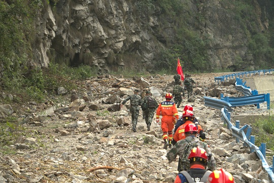 面對種種困難,官兵沉著應戰(zhàn),踩著松軟的泥漿、尖銳石塊,沿著泥濘的山路,一步一步踉蹌前行。他們一邊冒險搶修道路,一邊爭分奪秒晝夜兼程向受災最重的方向突擊開進。