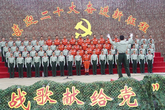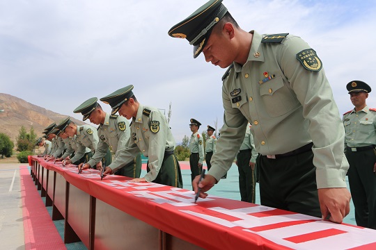武警青海總隊機動二支隊演訓(xùn)場上,官兵們跨彈坑、攀云梯、翻高墻……突然一聲哨響:全體集合!大家集體重溫入黨誓詞。之后,官兵在寫有“永遠聽黨話,堅定跟黨走,喜迎二十大,奮進新征程”的橫幅上寫下自己的名字。