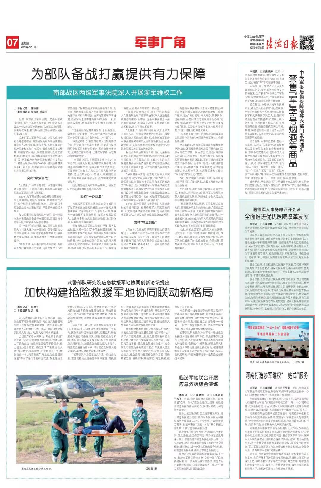 本報(bào)訊 記者廉穎婷 通訊員王翌丞 近日,河南省軍人軍屬法律援助工作站、解放軍鄭州軍事法院訴訟服務(wù)中心揭(掛)牌暨涉軍維權(quán)工作座談會(huì)在鄭州舉行。