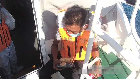 圖為執(zhí)法員安撫該遇險漁民并提供飲水食物。