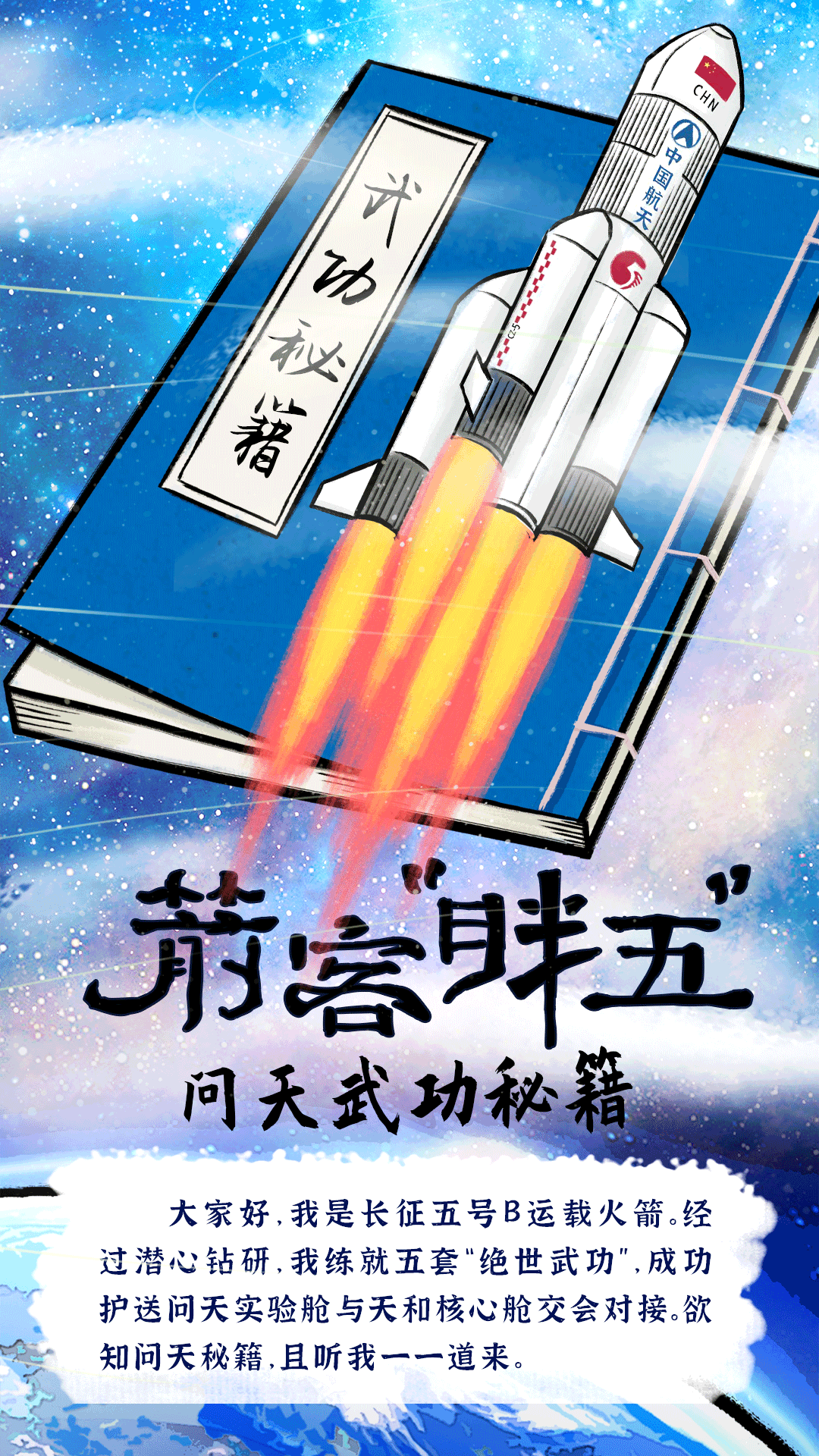 大家好,我是長(zhǎng)征五號(hào)B運(yùn)載火箭。經(jīng)過(guò)潛心鉆研,我練就五套“絕世武功”,成功護(hù)送問(wèn)天實(shí)驗(yàn)艙與天和核心艙交會(huì)對(duì)接。欲知問(wèn)天秘籍,且聽(tīng)我一一道來(lái)。