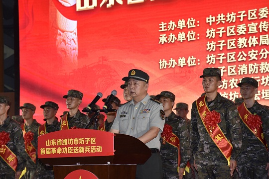 圖為濰坊軍分區(qū)大校司令員薛曉鵬寄語新兵。
