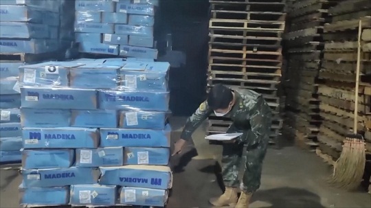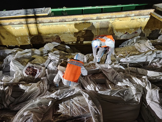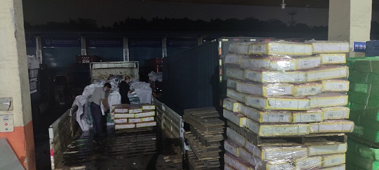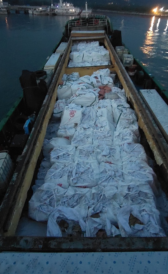 經(jīng)查,該嫌疑船艙內(nèi)滿(mǎn)裝大量白色編制袋貨物一批,經(jīng)開(kāi)箱查驗(yàn),發(fā)現(xiàn)箱內(nèi)裝有涉嫌走私雪花牛肉、牛黃喉、牛百葉等來(lái)源不明凍品,共約200余噸。隨船人員均未能提供船舶證件及該批貨物合格來(lái)源相關(guān)證明,隨即執(zhí)法員依法對(duì)涉案船舶及所載凍品進(jìn)行查扣。