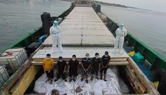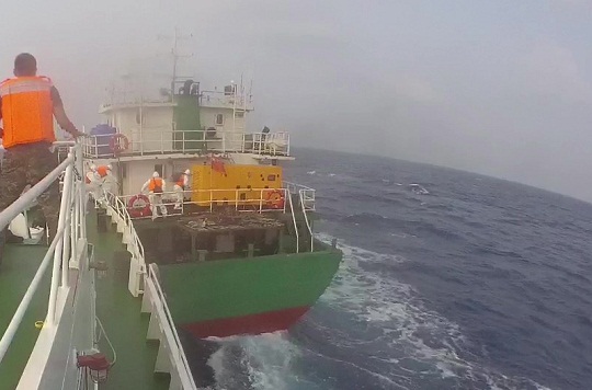 當(dāng)日7時(shí)55分,海上風(fēng)浪較大,執(zhí)法艇與前來(lái)增援的多艘執(zhí)法艇一起對(duì)其進(jìn)行圍堵攔截,在執(zhí)法艇與該嫌疑船船尾相靠瞬間,執(zhí)法員找準(zhǔn)時(shí)機(jī)對(duì)其進(jìn)行強(qiáng)制跳幫,并強(qiáng)行控制目標(biāo)船只,現(xiàn)場(chǎng)查控嫌疑人6名。